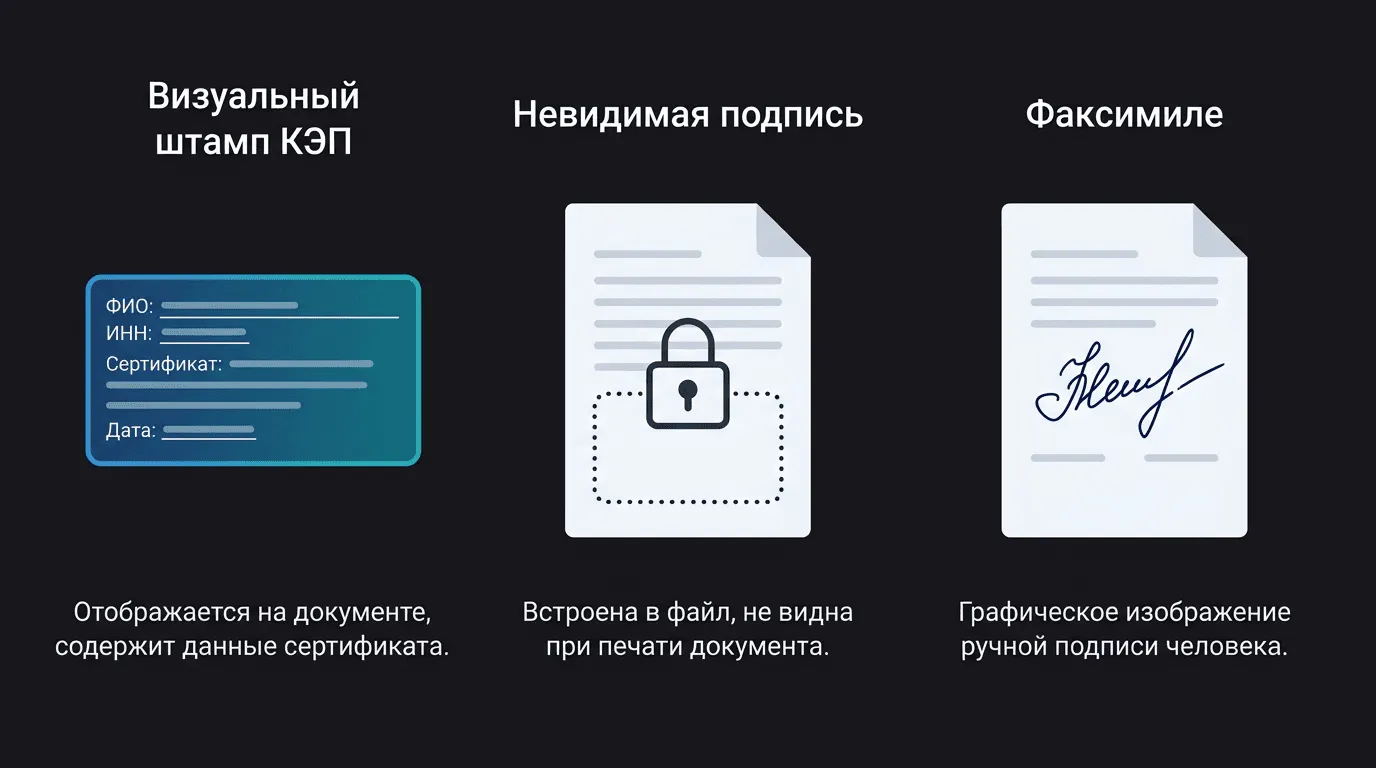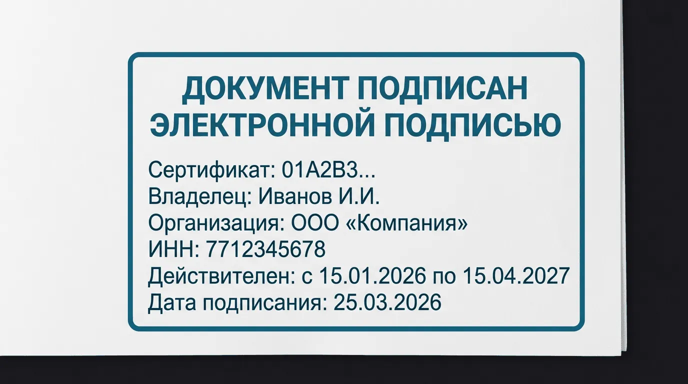 Электронная подпись может выглядеть совершенно по-разному — от синего прямоугольника до полностью невидимой метки в метаданных файла. Разберём каждый вариант.